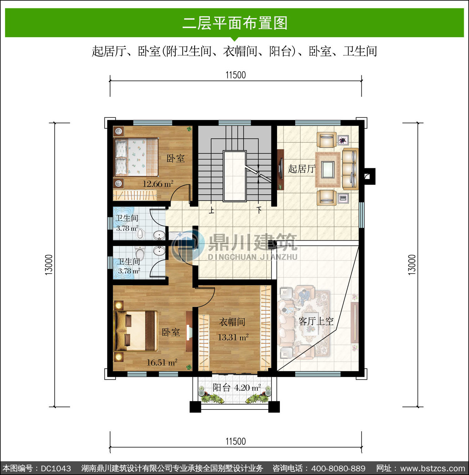 | 二 層: | 起居廳、臥室(附衛生間、衣帽間、陽臺)、臥室、衛生間 | |||