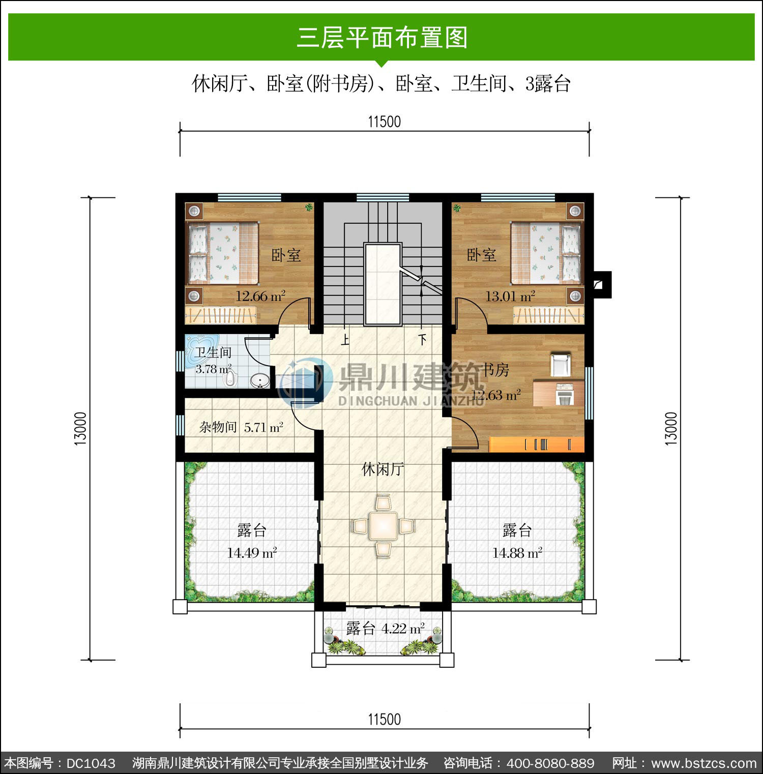 | 三 層: | 休閑廳、臥室(附書房)、臥室、衛生間、3露臺 | |||