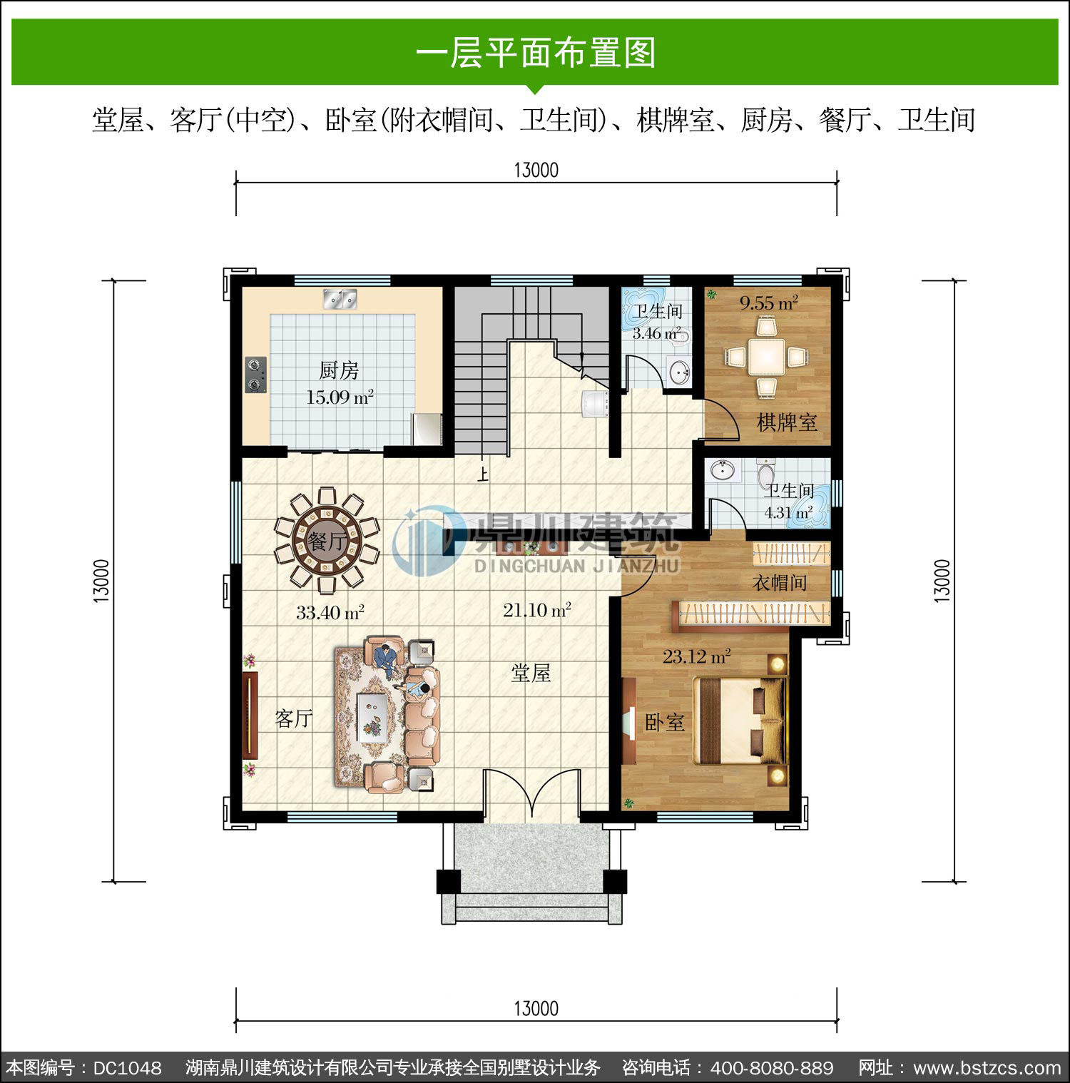 | 一 層: | 堂屋、客廳(中空)、臥室(附衣帽間、衛生間)、棋牌室、廚房、餐廳、衛生間 | |||