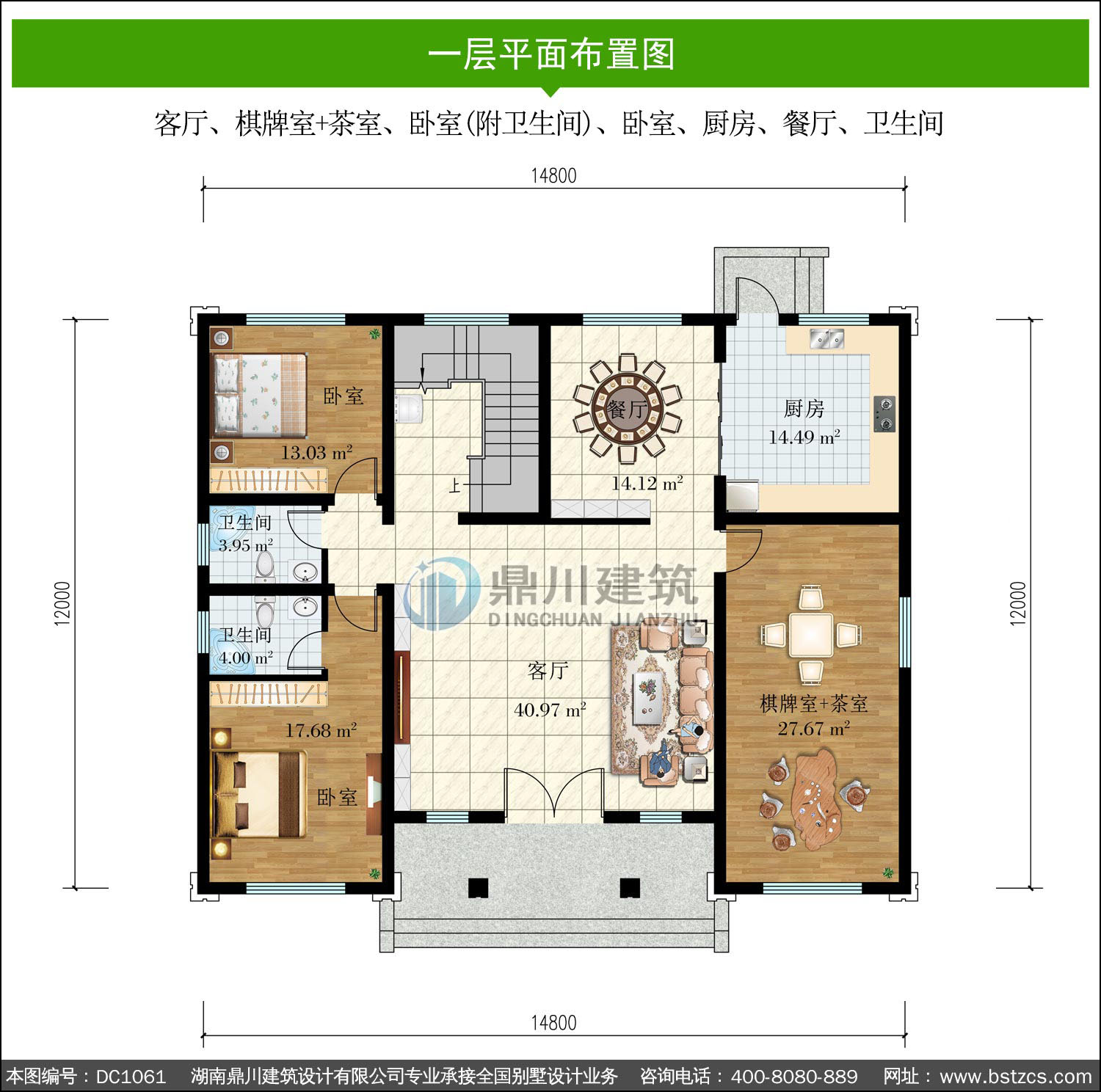 | 一 層: | 客廳、棋牌室+茶室、臥室(附衛(wèi)生間)、臥室、廚房、餐廳、衛(wèi)生間 | |||