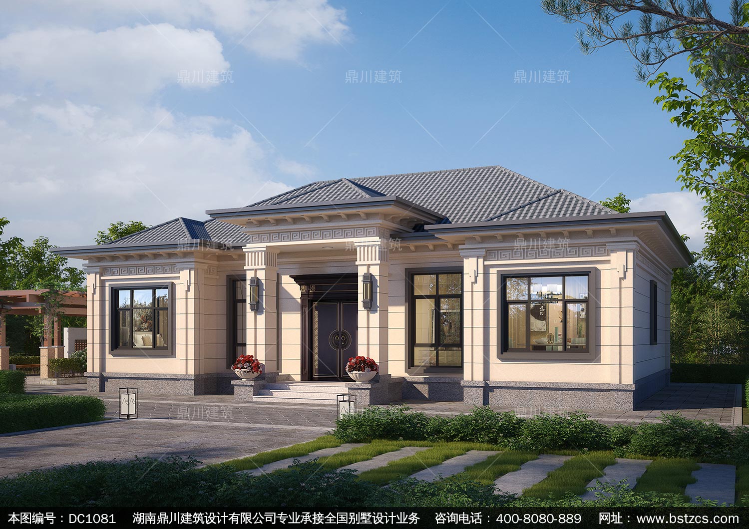 新中式一層別墅施工圖紙及外觀效果圖_農村自建別墅設計,鼎川建筑