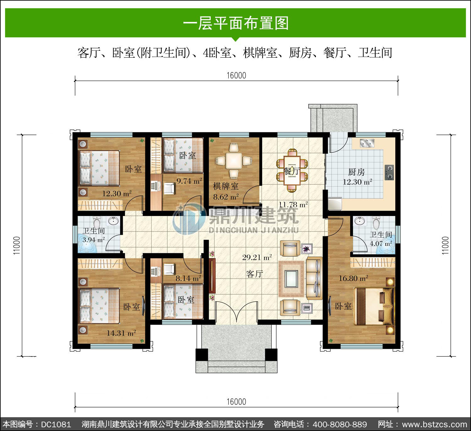 | 一 層: | 客廳、臥室(附衛生間)、4臥室、棋牌室、廚房、餐廳、衛生間 | |||