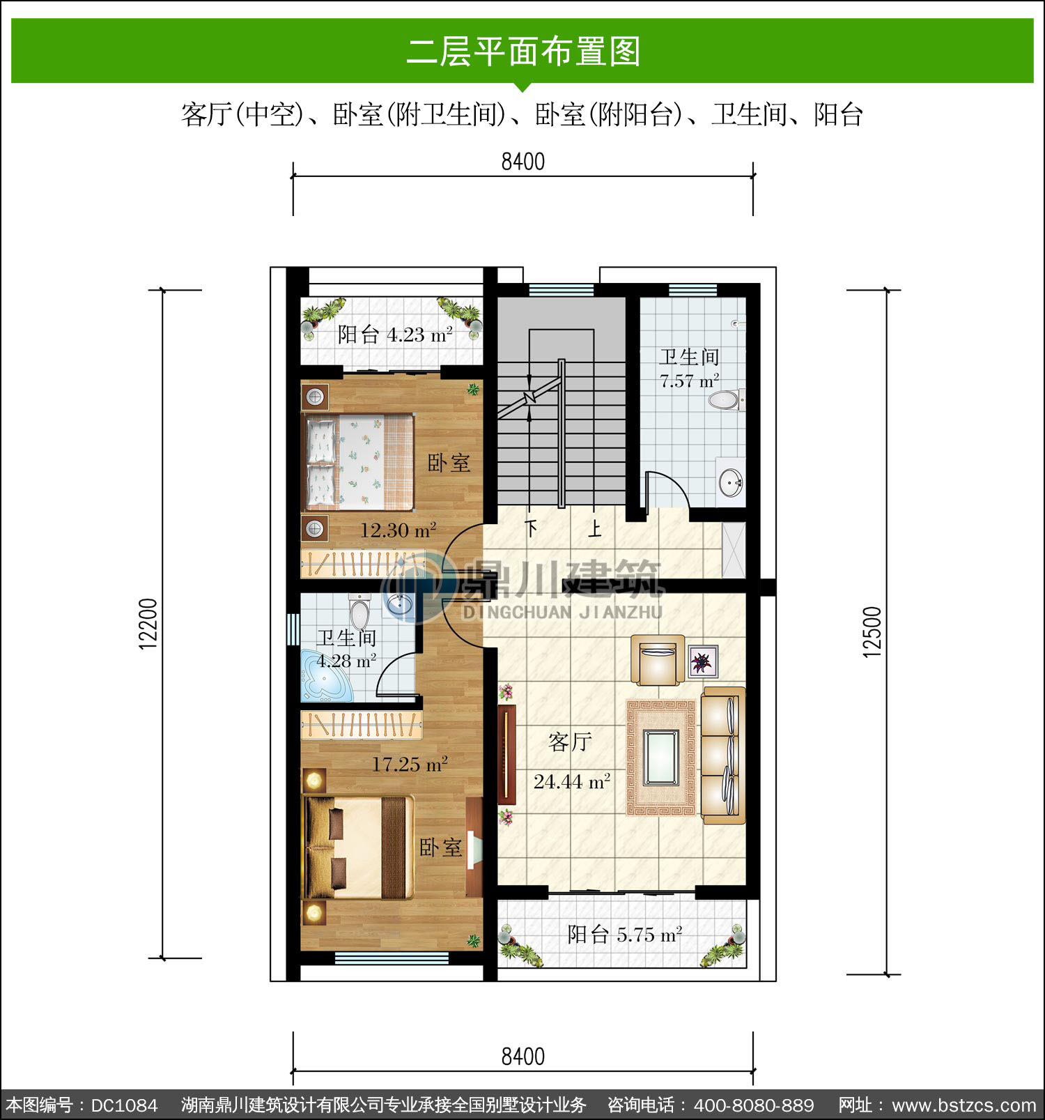 | 二 層: | 客廳(中空)、臥室(附衛生間)、臥室(附陽臺)、衛生間、陽臺 | |||