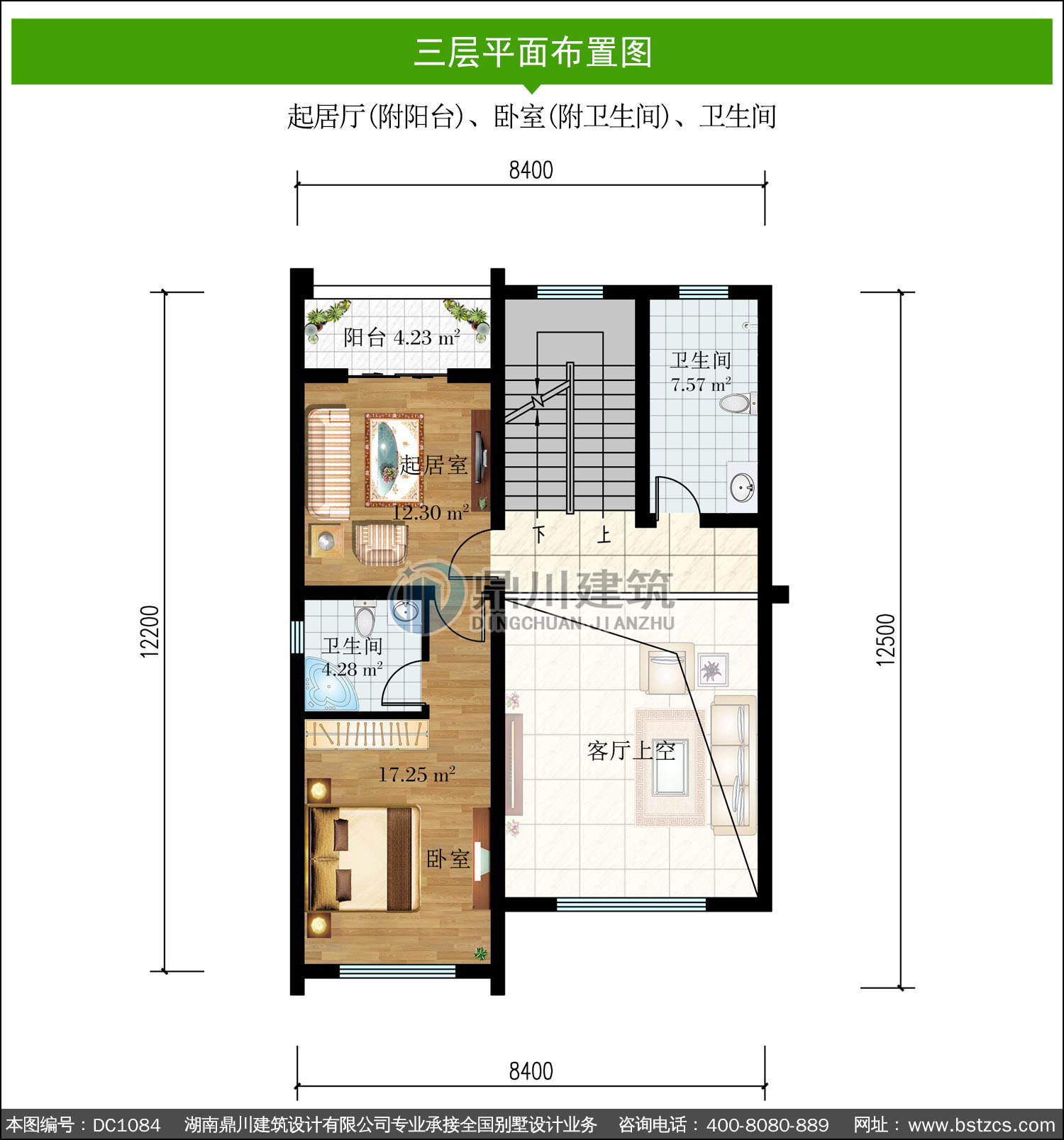 | 三 層: | 起居廳(附陽臺)、臥室(附衛生間)、衛生間 | |||