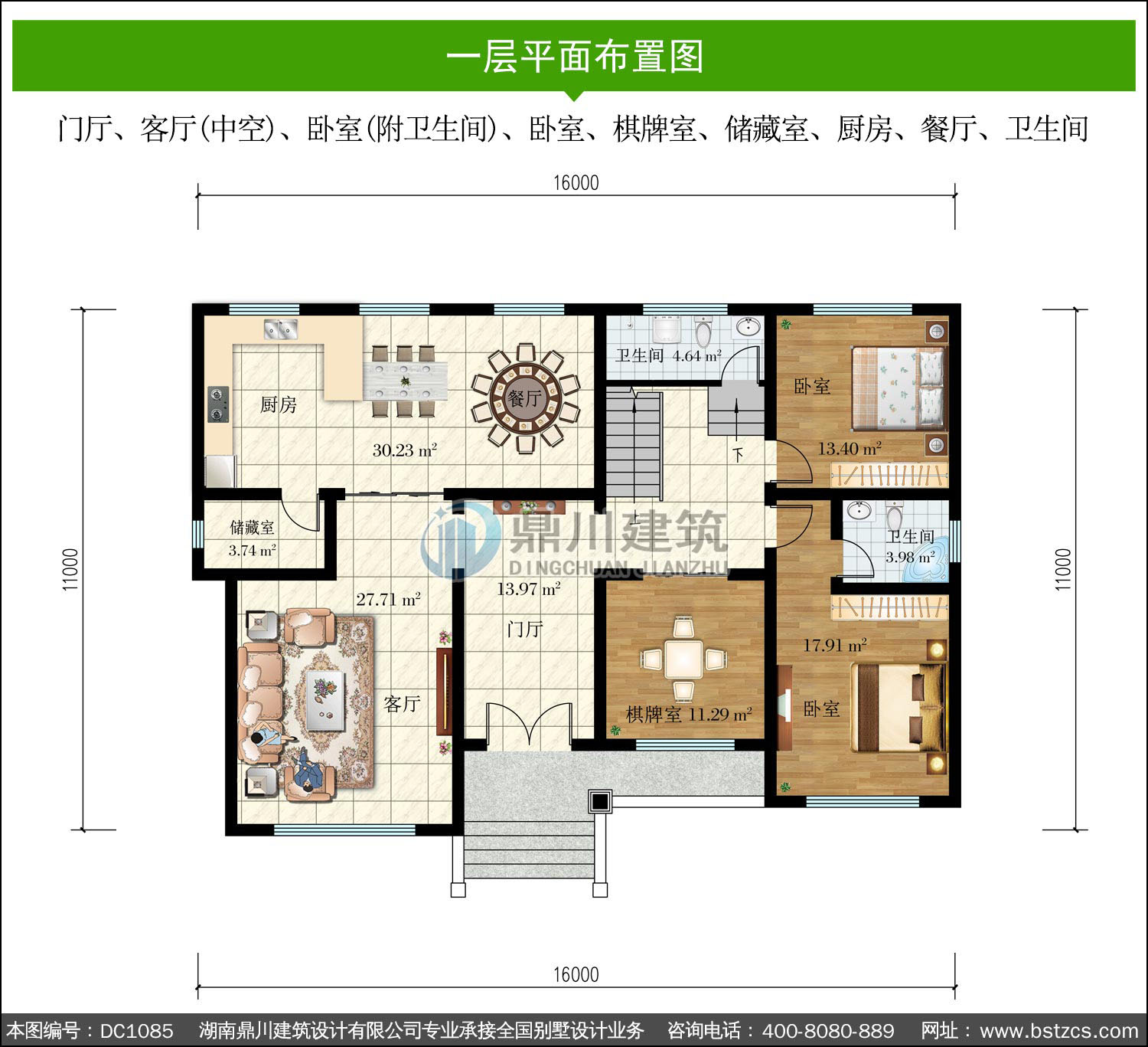 | 一 層: | 門廳、客廳(中空)、臥室(附衛生間)、臥室、棋牌室、儲藏室、廚房、餐廳、衛生間 | |||