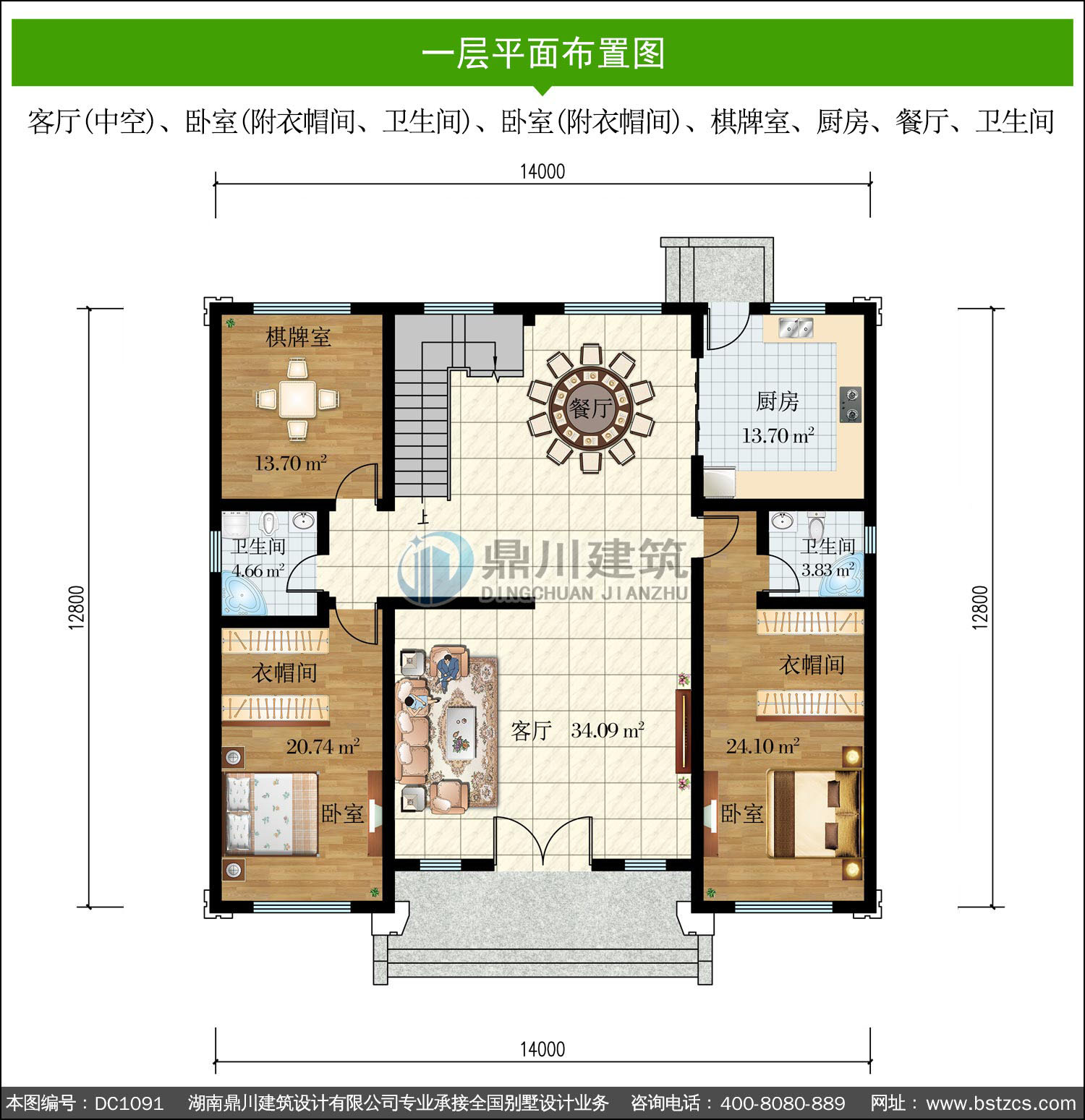 | 一 層: | 客廳(中空)、臥室(附衣帽間、衛(wèi)生間)、臥室(附衣帽間)、棋牌室、廚房、餐廳、衛(wèi)生間 | |||