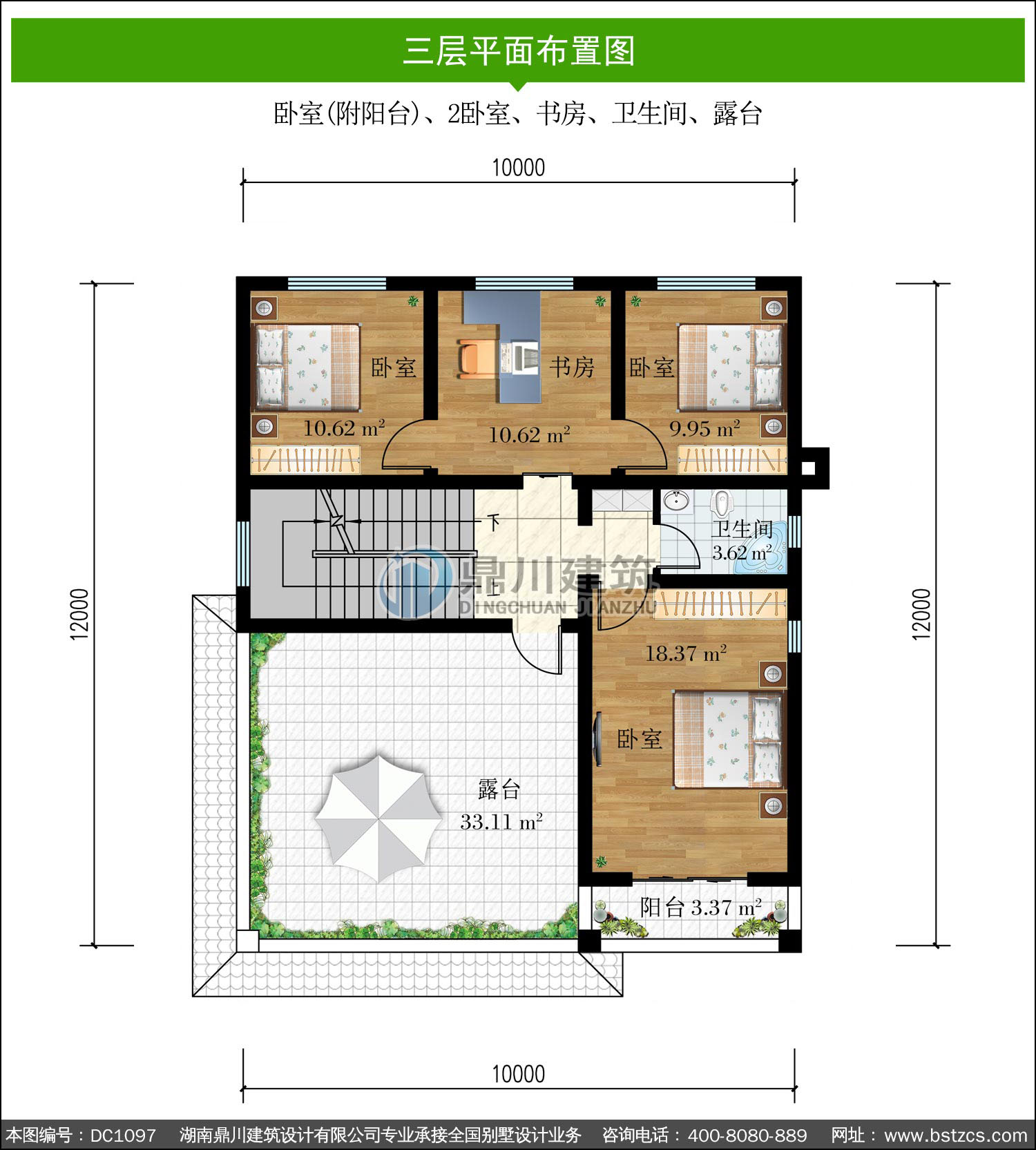 | 三 層: | 臥室(附陽臺)、2臥室、書房、衛(wèi)生間、露臺 | |||