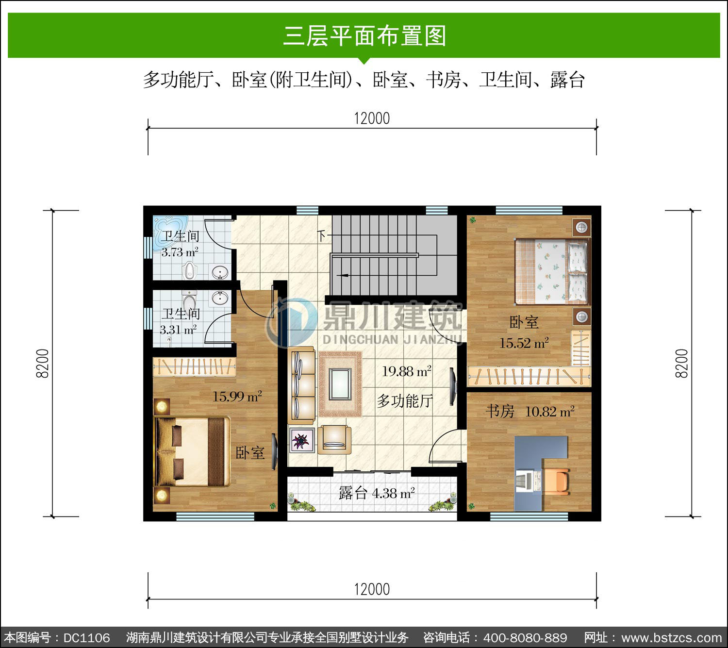 | 三 層: | 多功能廳、臥室(附衛生間)、臥室、書房、衛生間、露臺 | |||