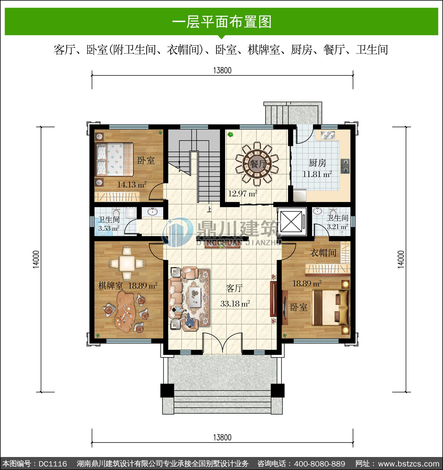 | 一 層: | 客廳、臥室(附衛(wèi)生間、衣帽間)、臥室、棋牌室、廚房、餐廳、衛(wèi)生間 | |||