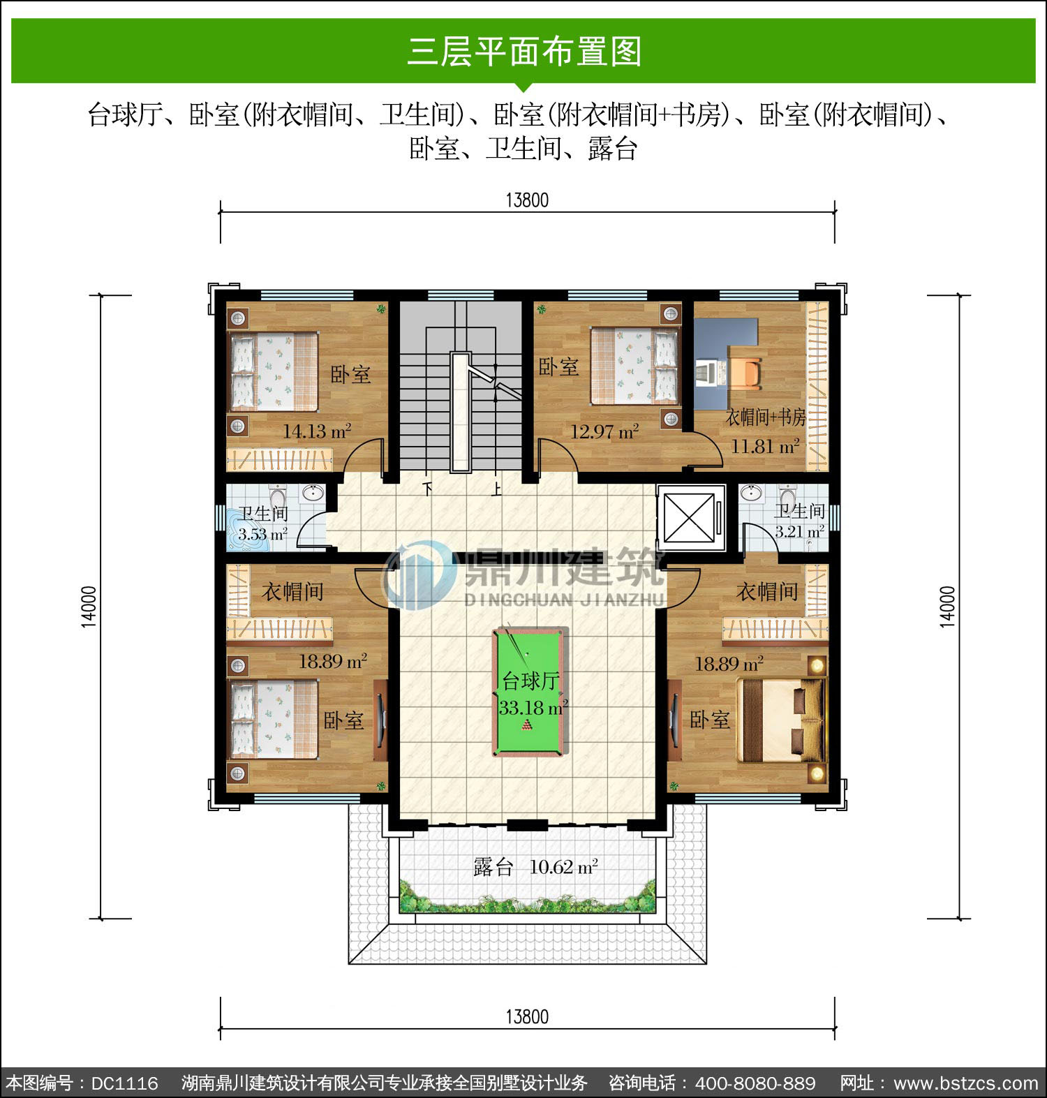 | 三 層: | 臺球廳、臥室(附衣帽間、衛(wèi)生間)、臥室(附衣帽間+書房)、臥室(附衣帽間)、臥室、衛(wèi)生間、露臺 | |||