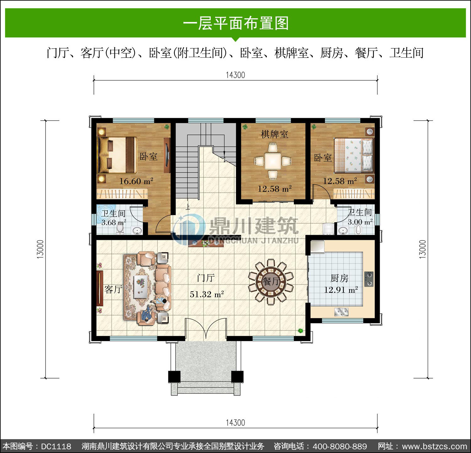| 一 層: | 門廳、客廳(中空)、臥室(附衛生間)、臥室、棋牌室、廚房、餐廳、衛生間 | |||