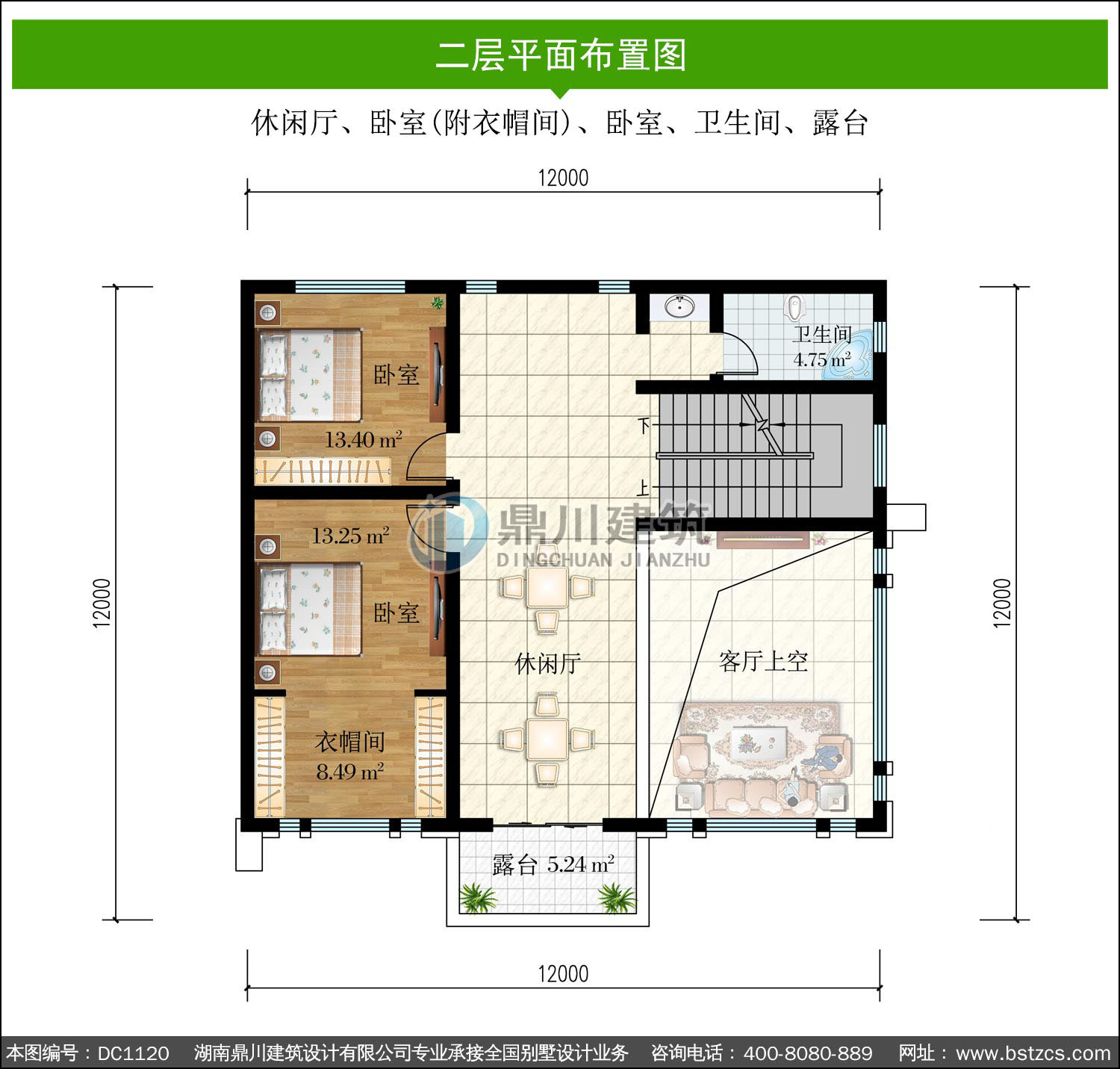 | 二 層: | 休閑廳、臥室(附衣帽間)、臥室、衛生間、露臺 | |||
