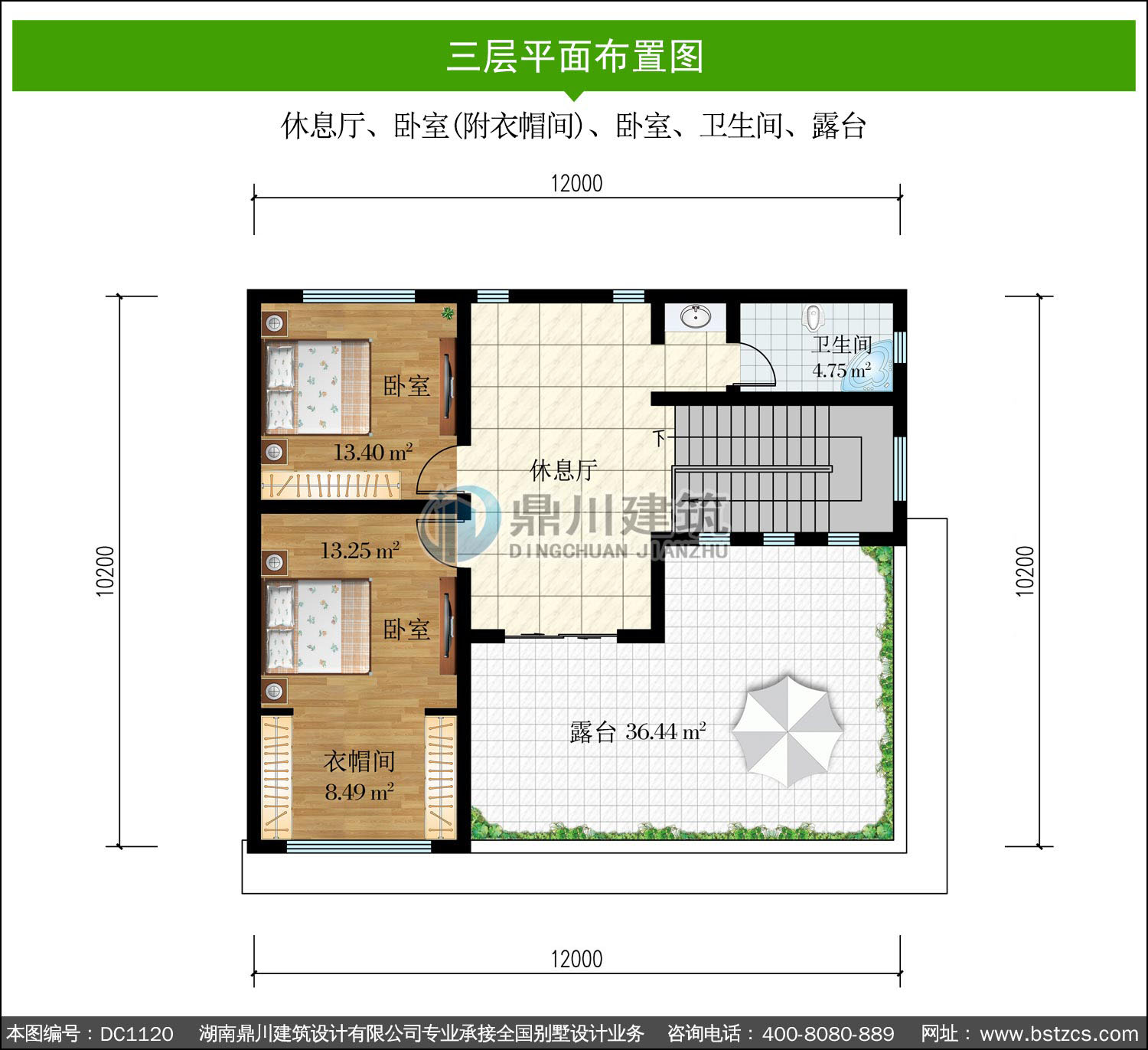 | 三 層: | 休息廳、臥室(附衣帽間)、臥室、衛生間、露臺 | |||