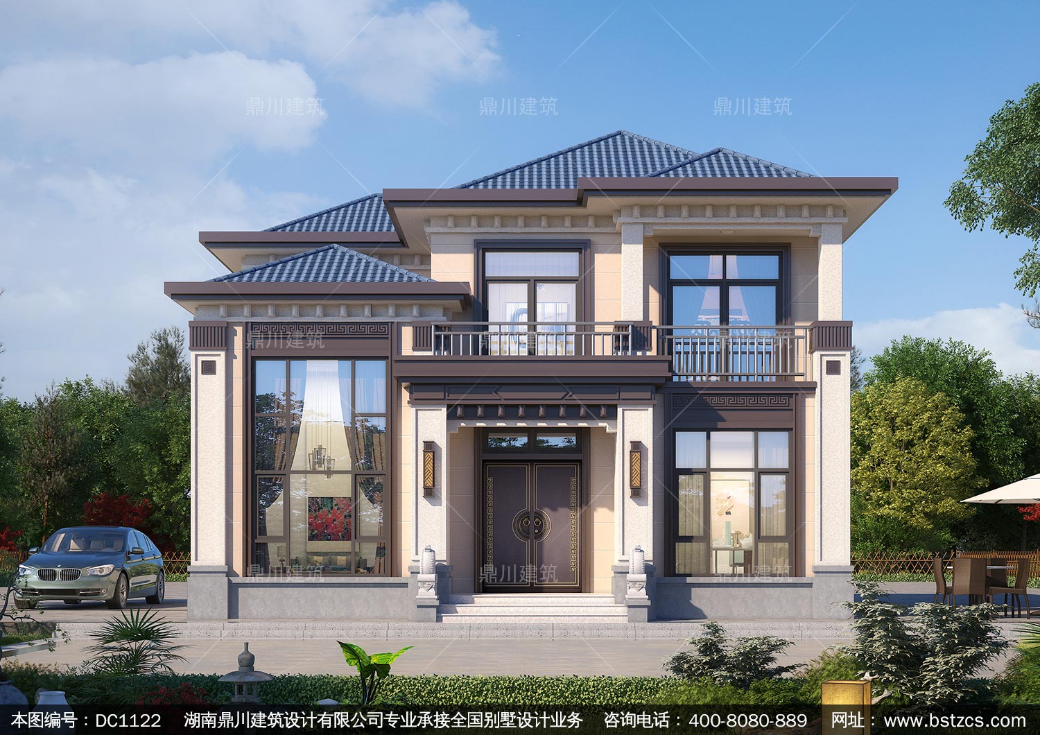 新中式二層帶露臺別墅圖紙及效果圖_新農村自建別墅設計,鼎川建