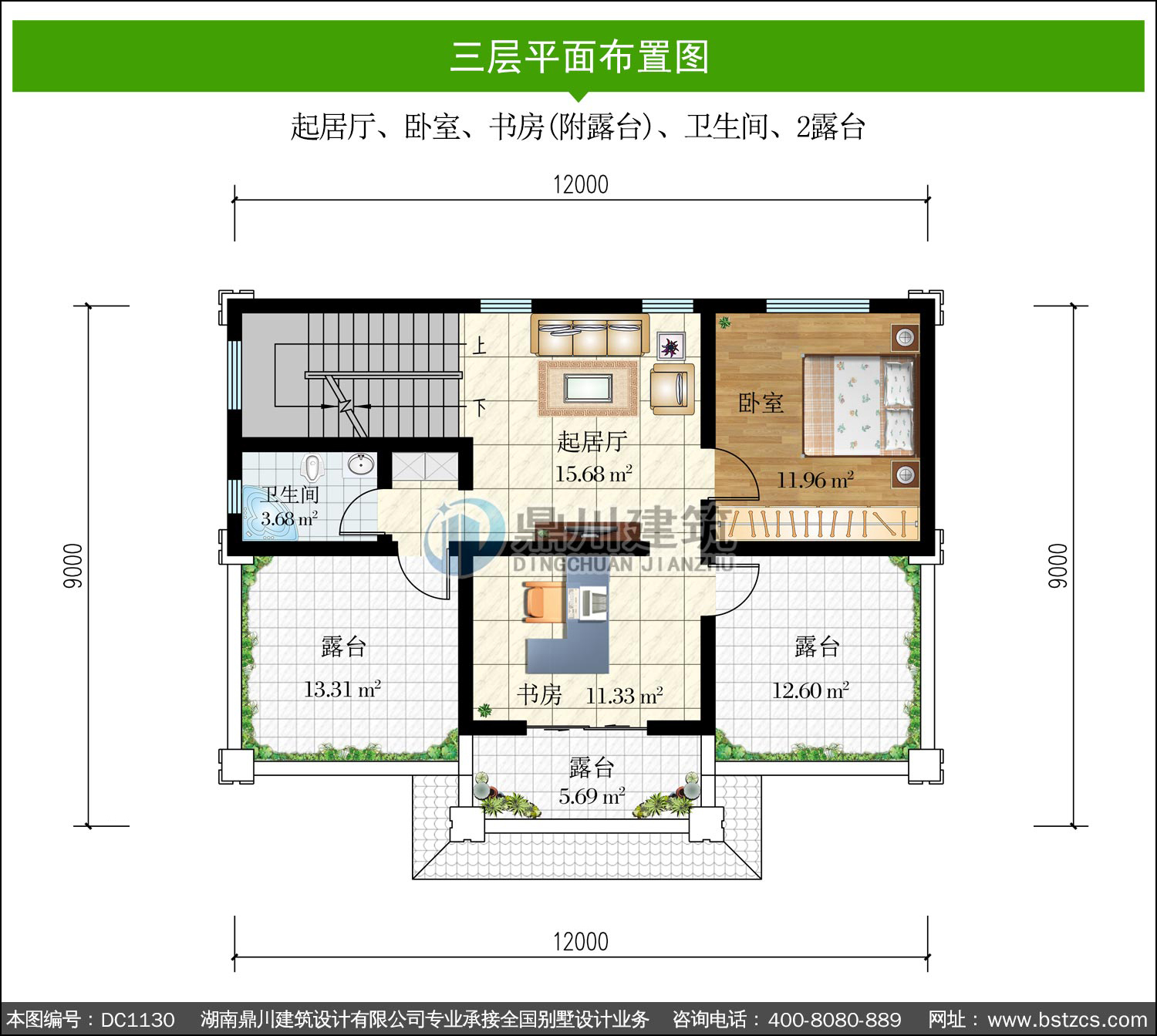 | 三 層: | 起居廳、臥室、書房(附露臺)、衛生間、2露臺 | |||