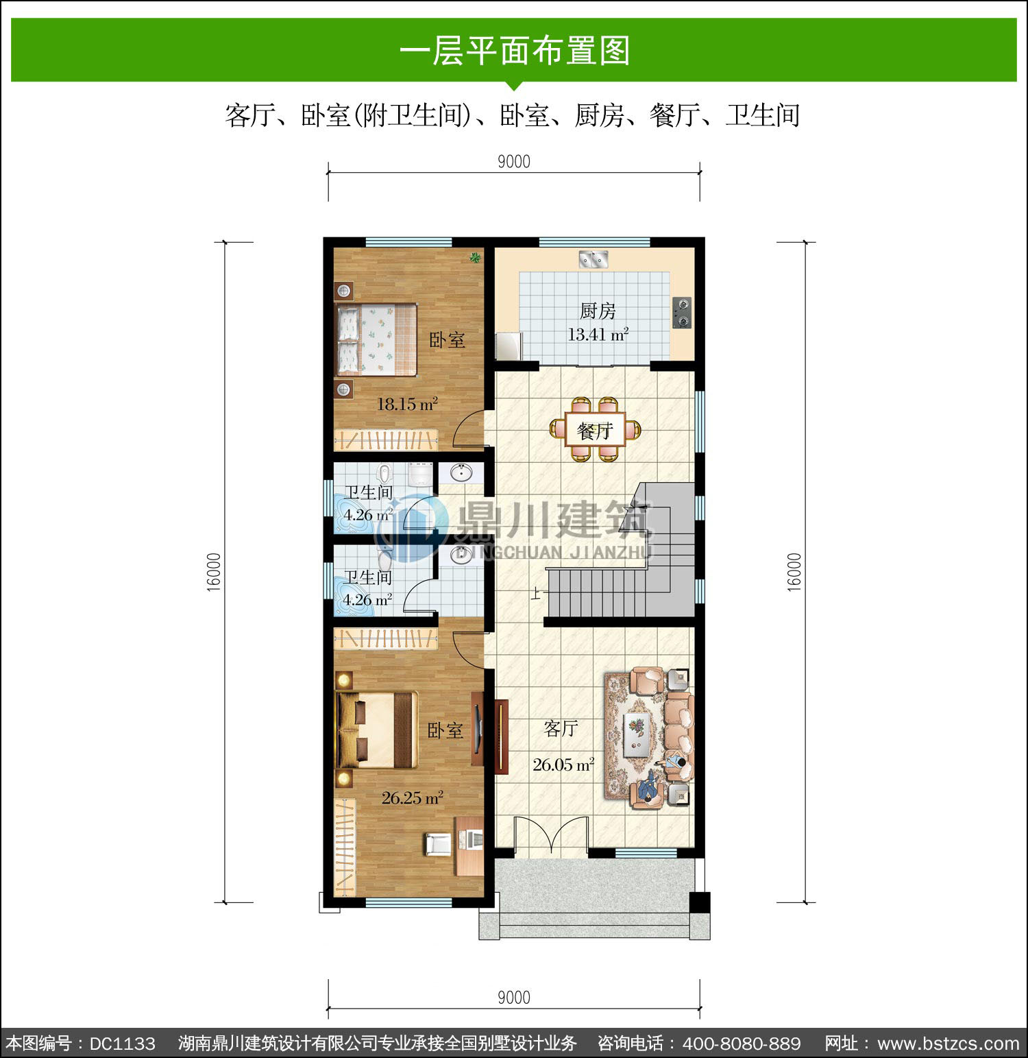 | 一 層: | 客廳、臥室(附衛生間)、臥室、廚房、餐廳、衛生間 | |||