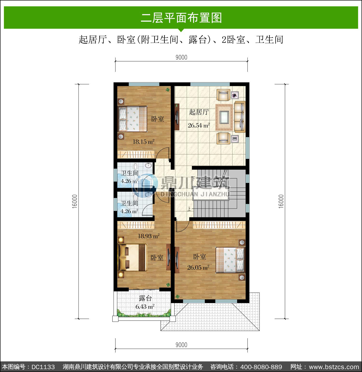 | 二 層: | 起居廳、臥室(附衛生間、露臺)、2臥室、衛生間 | |||