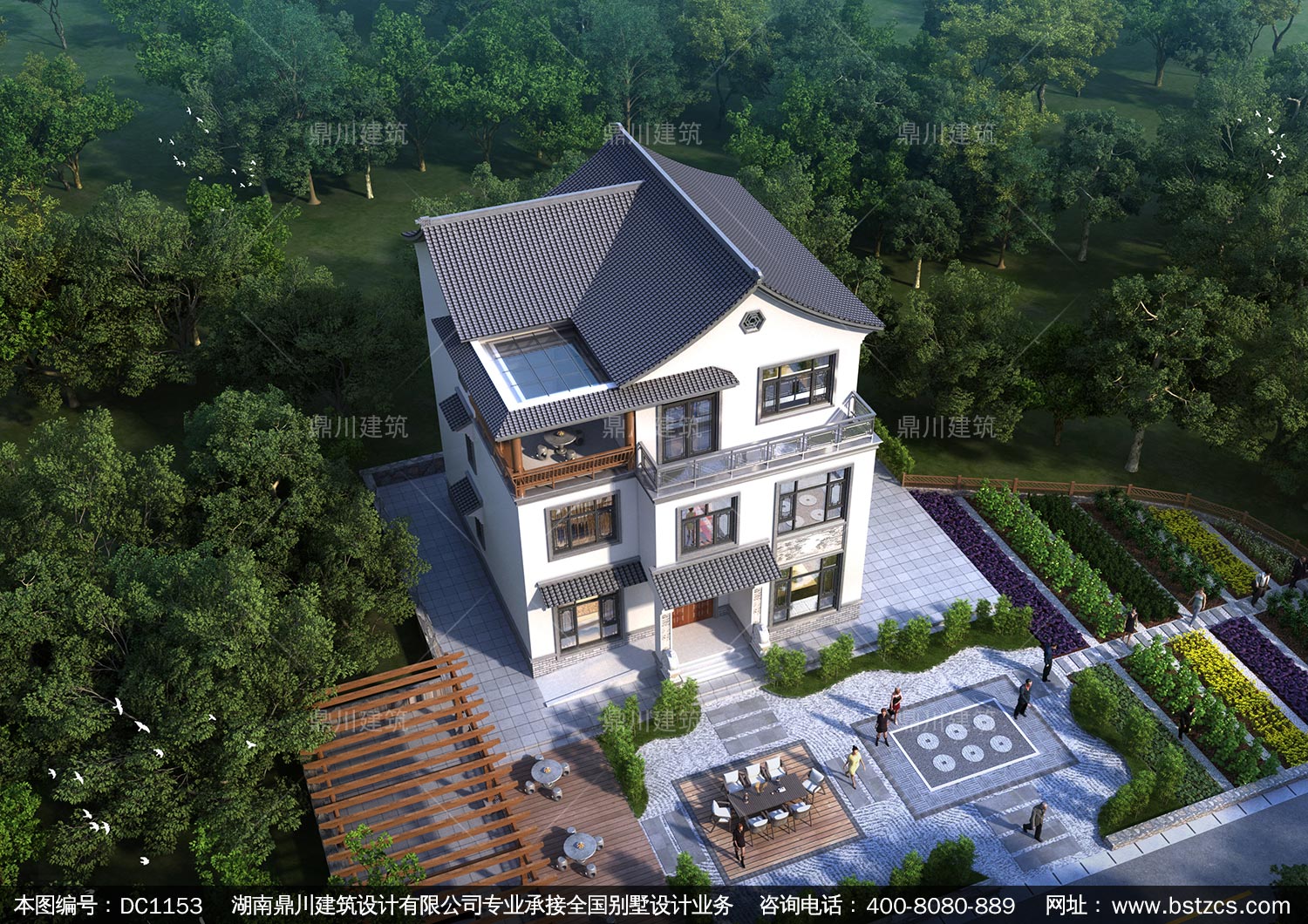 三層中式帶車庫別墅圖紙及效果圖_新農村三層自建房屋設計,鼎川