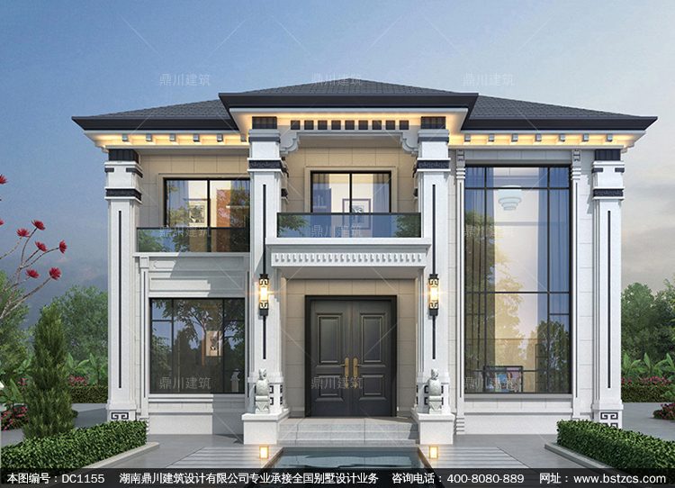 新中式二層帶陽臺別墅圖紙及效果圖_農村自建別墅設計,鼎川建筑