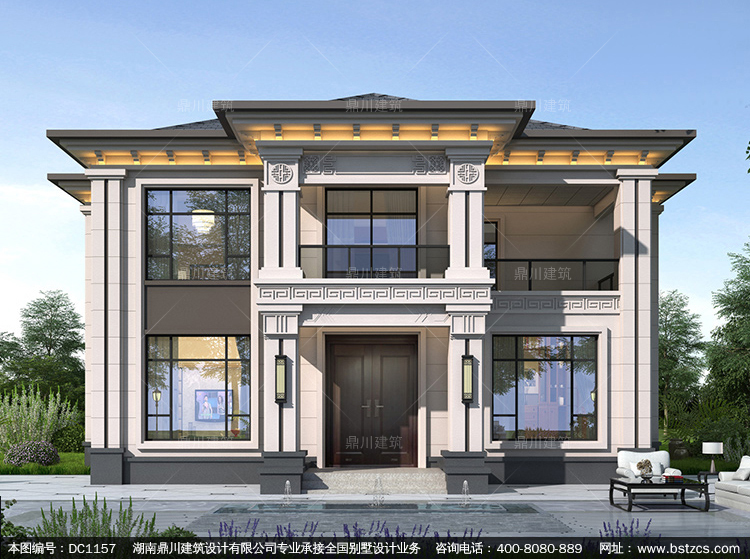 新中式二層帶陽臺別墅圖紙及效果圖_農村自建別墅設計,鼎川建筑
