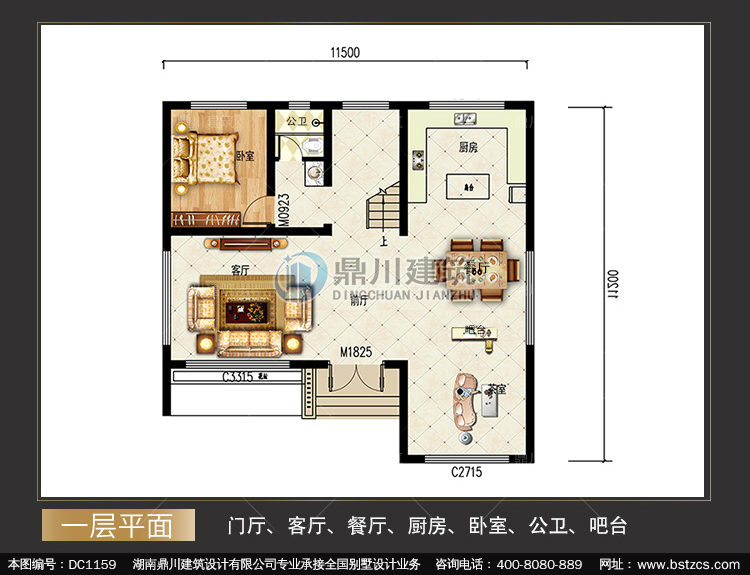 | 一 層: | 門廳、客廳、餐廳、廚房、臥室、公衛、吧臺 | |||