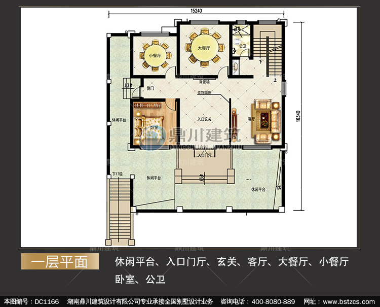 | 一 層: | 休閑平臺、玄關、客廳、大餐廳、小餐廳、臥室、公衛 | |||