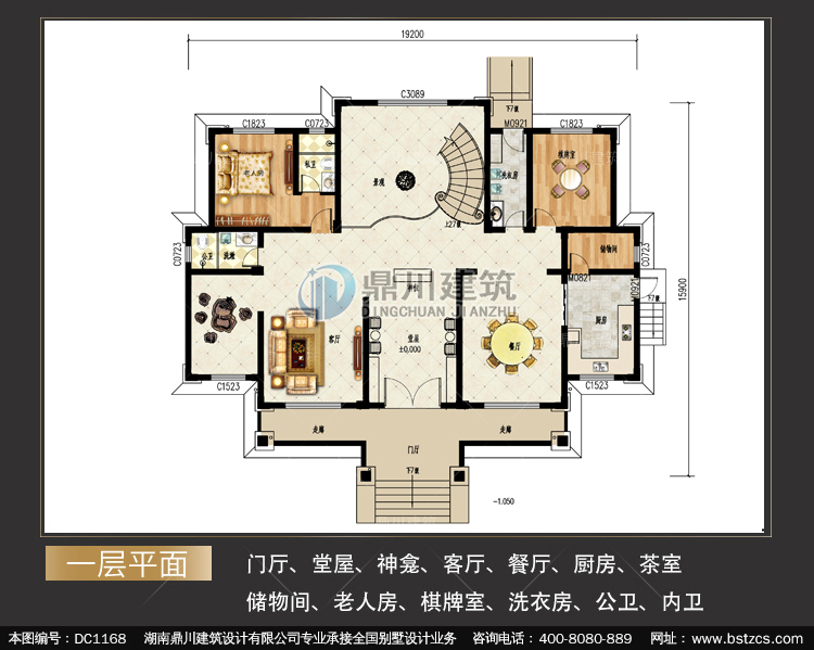 | 一 層: | 門廳、堂屋、神龕、客廳、餐廳、廚房、茶室、儲物間、老人房、棋牌室、洗衣房、公衛(wèi)、內(nèi)衛(wèi) | |||