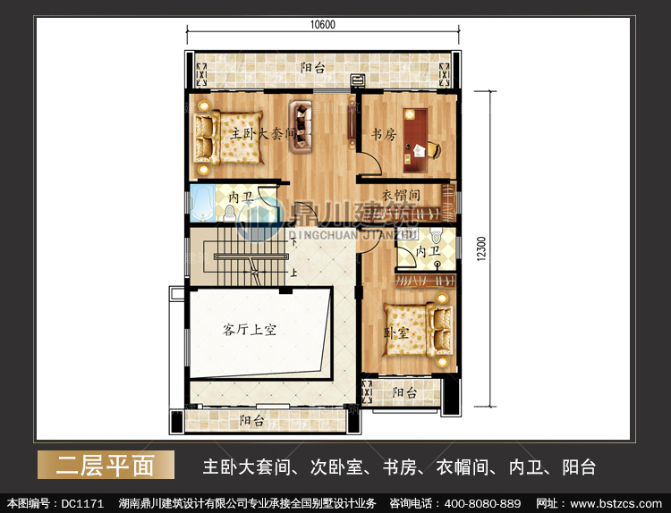 | 二 層: | 主臥大套間、次臥室、書房、衣帽間、內衛、陽臺 | |||
