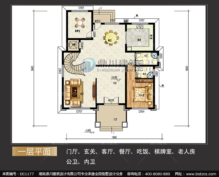 | 一 層: | 門廳、玄關、客廳、餐廳、吃飯、棋牌室、老人房、公衛、內衛 | |||