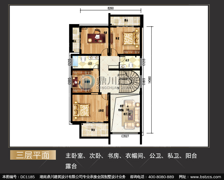 | 三 層: | 主臥室、次臥、書房、衣帽間、公衛、私衛、陽臺、露臺 | |||