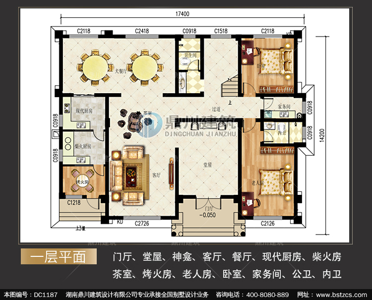 | 一 層: | 門廳、堂屋、神龕、客廳、餐廳、現(xiàn)代廚房、柴火房室、烤火房、老人房、臥室、家務間、公衛(wèi)、內(nèi)衛(wèi) | |||