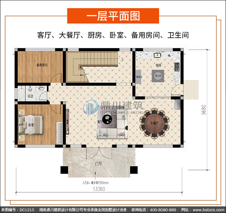 | 一 層: | 客廳、大餐廳、廚房、臥室、備用房間、衛生間 | |||