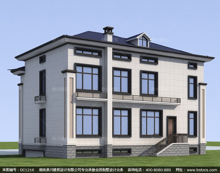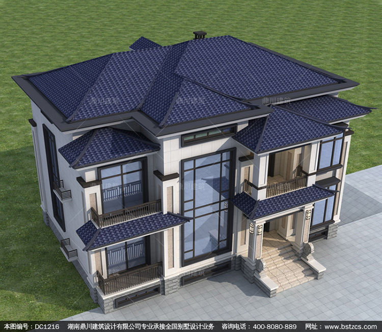 新中式二層帶露臺別墅圖紙及效果圖_新農村自建別墅設計,鼎川建