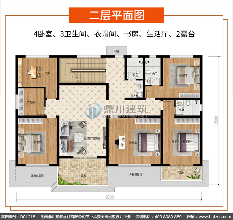 | 二 層: | 4臥室、3衛生間、衣帽間、書房、生活廳、2露臺 | |||