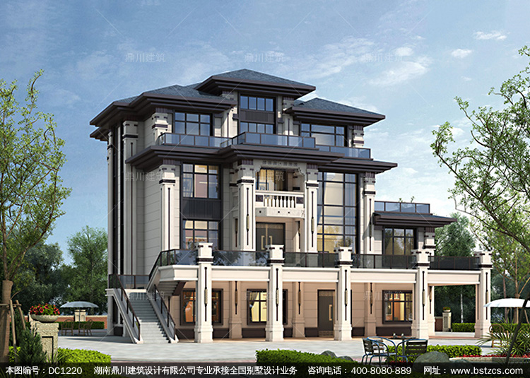 大氣新中式三層別墅施工圖紙及效果圖_新農村自建別墅設計,鼎川