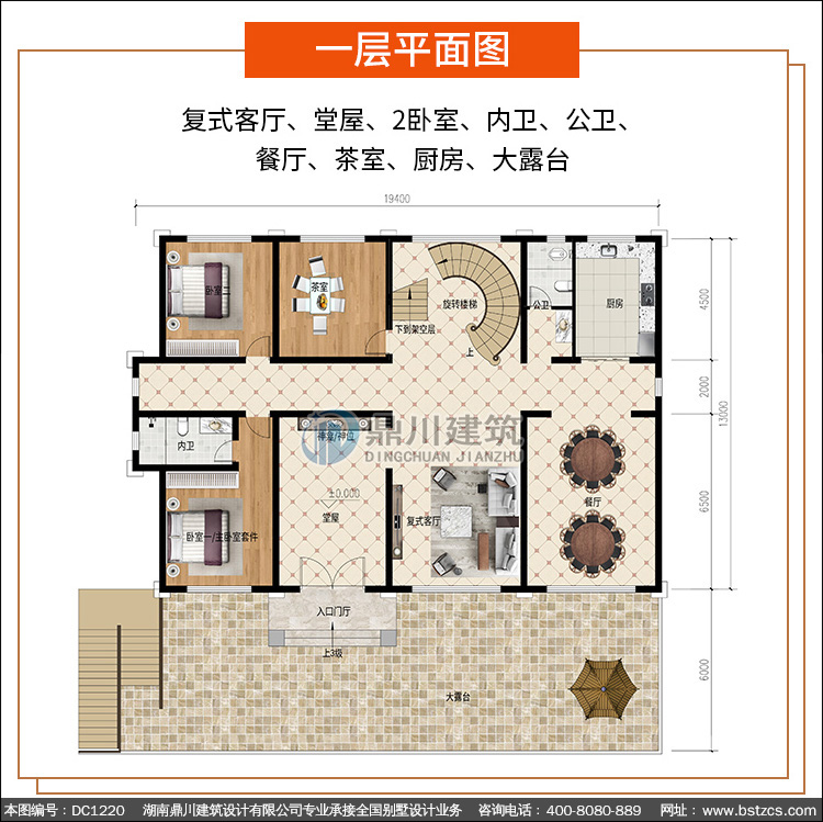 | 一 層: | 復式客廳、堂屋、2臥室、內衛、公衛、餐廳、茶室、廚房、大露臺 | |||