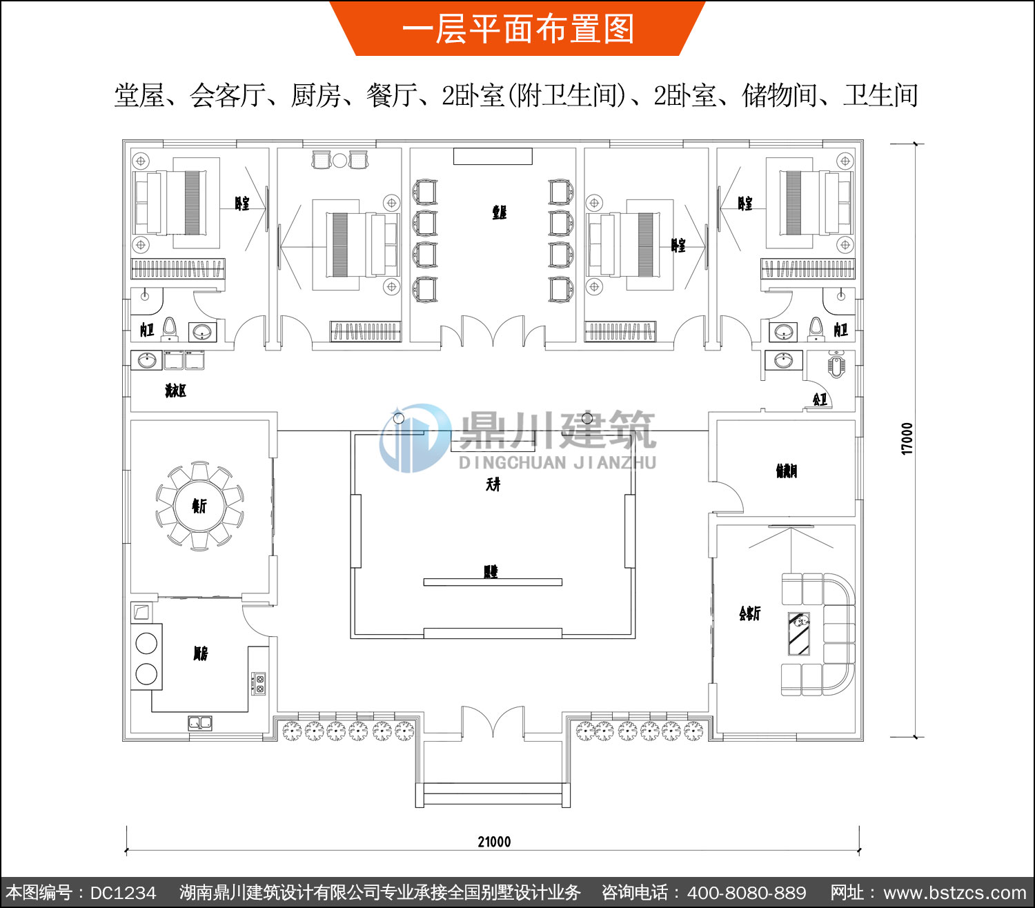 | 一 層: | 堂屋、會客廳、廚房、餐廳、2臥室(附衛生間)、2臥室、儲物間、衛生間 | |||