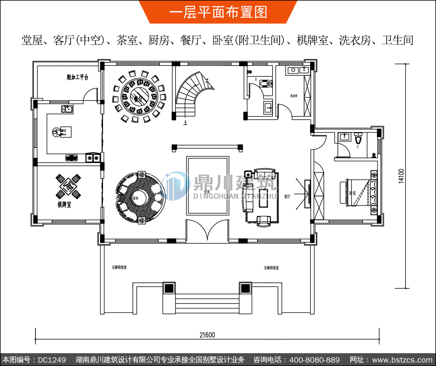 | 一 層: | 堂屋、客廳(中空)、茶室、廚房、餐廳、臥室(附衛(wèi)生間)、棋牌室、洗衣房、衛(wèi)生間 | |||