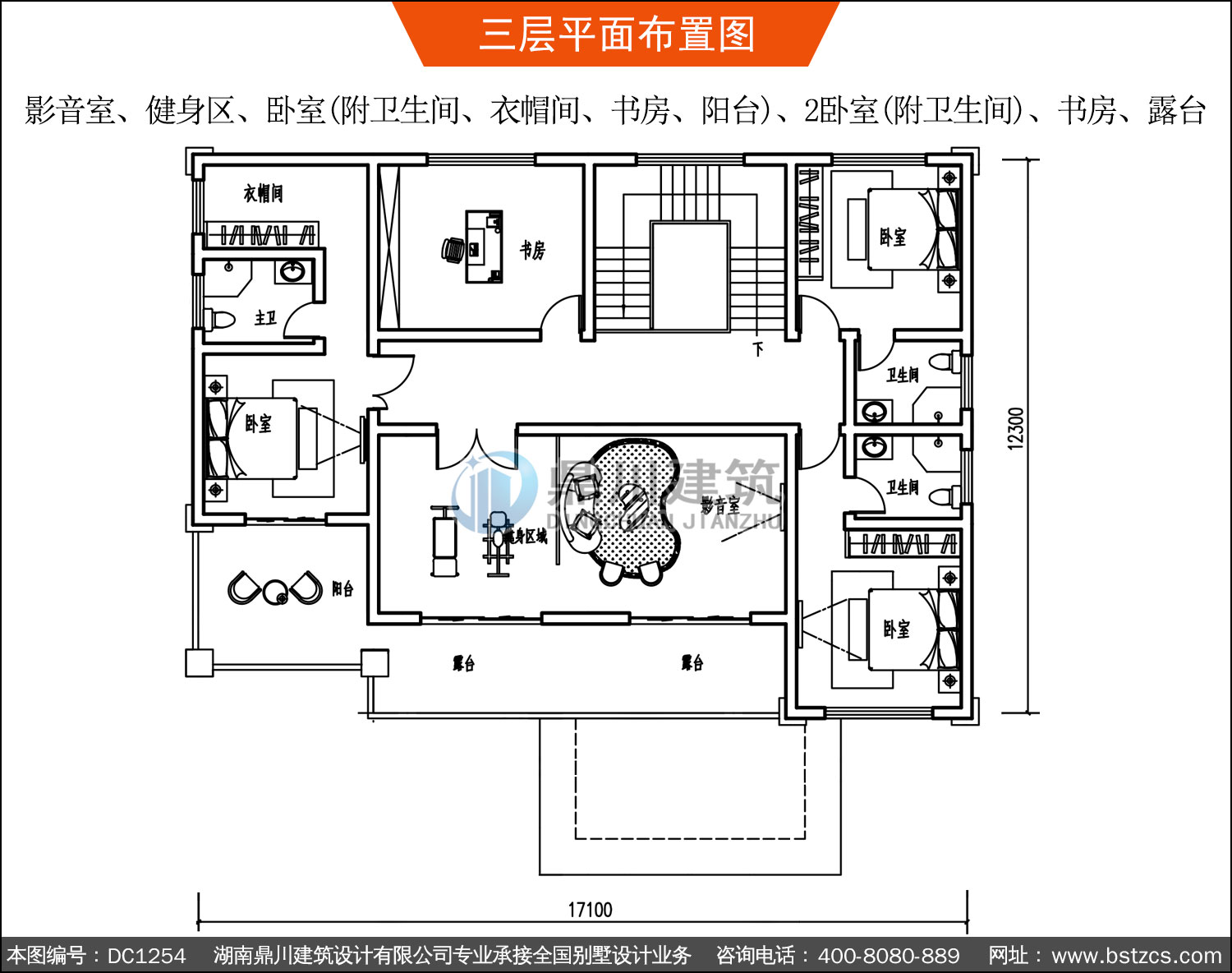| 三 層: | 影音室、健身區、臥室(附衛生間、衣帽間、書房、陽臺)、2臥室(附衛生間)、書房、露臺 | |||