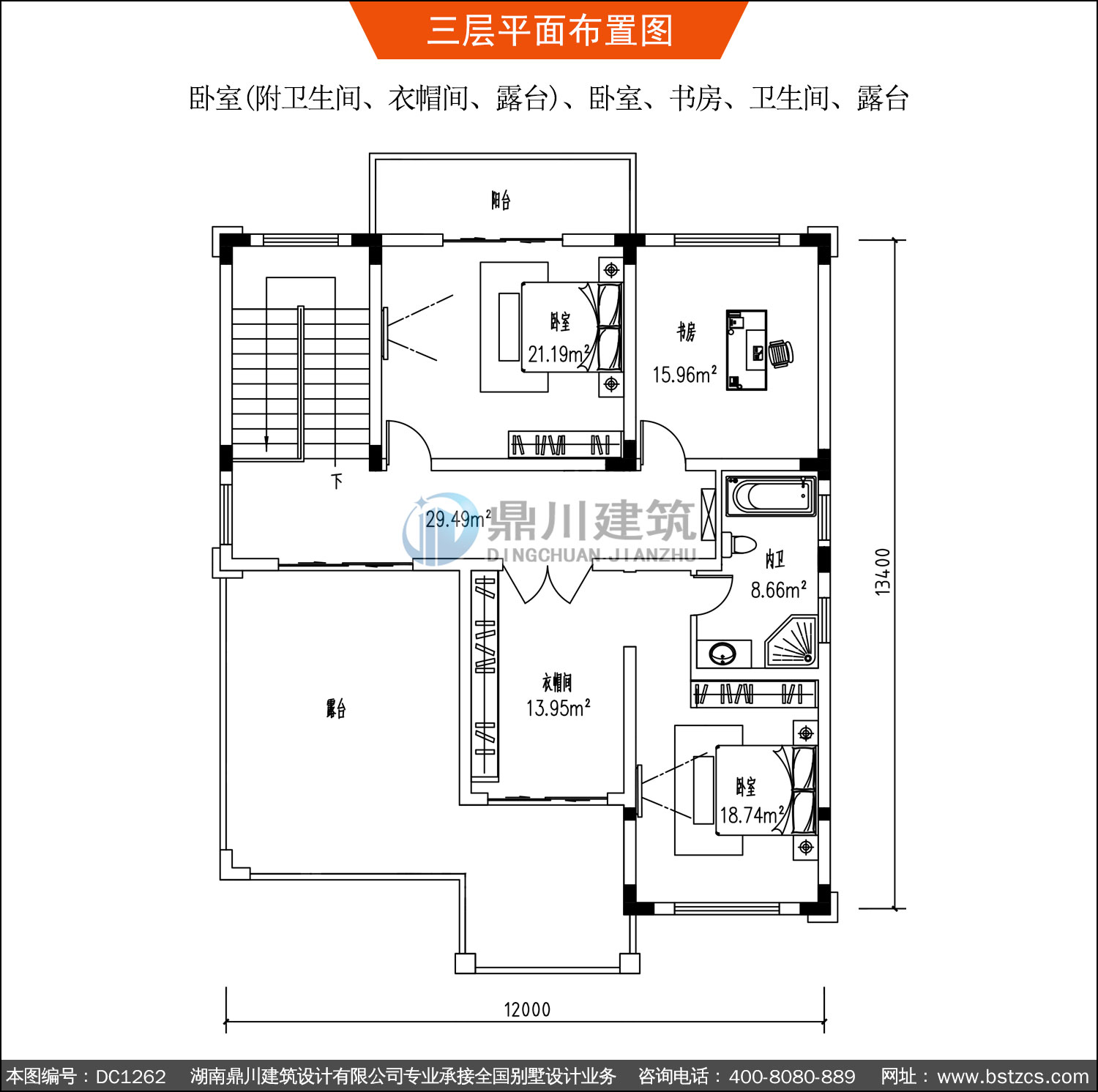 | 三 層: | 臥室(附衛生間、衣帽間、露臺)、臥室、書房、衛生間、露臺 | |||
