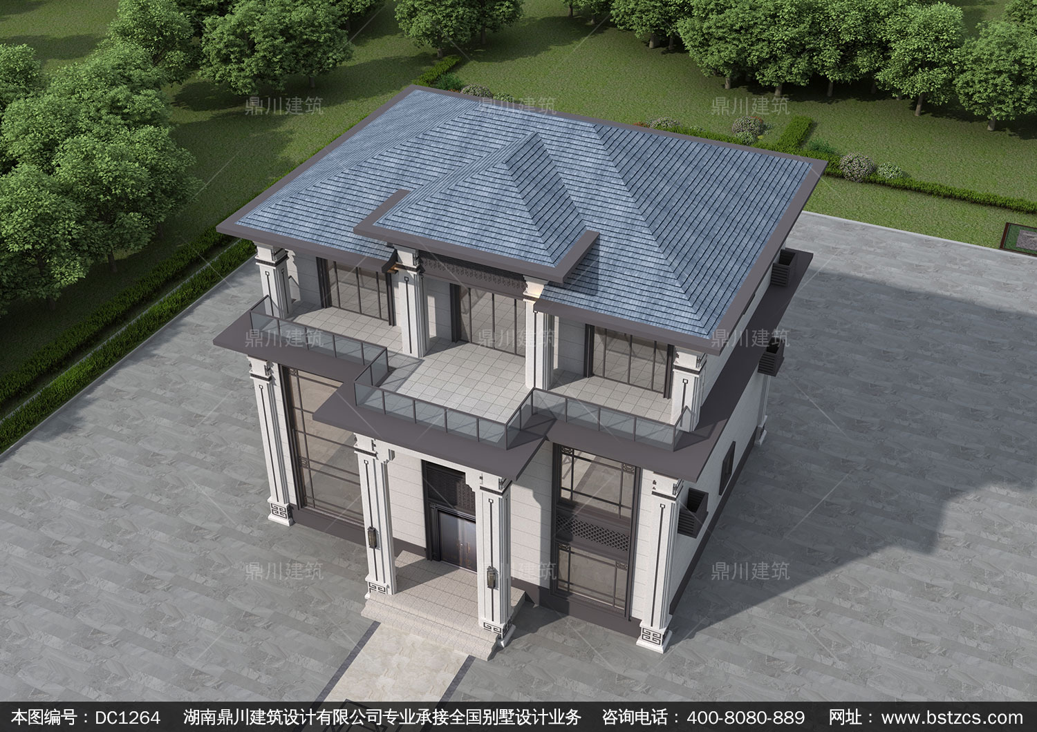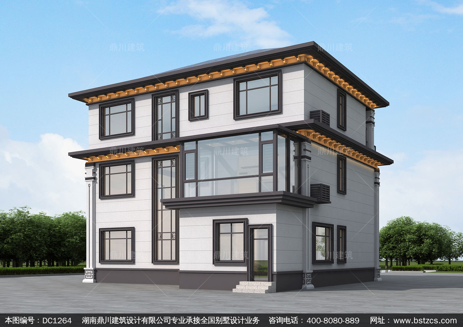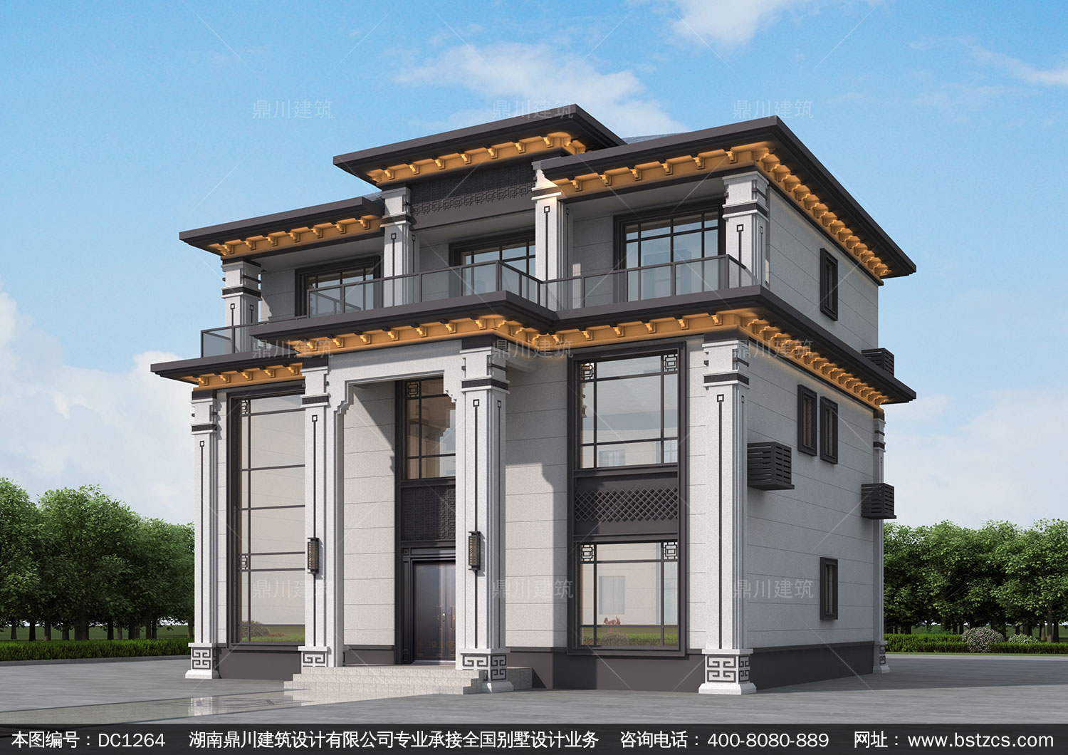 新中式三層帶露臺別墅圖紙效果圖_農村自建別墅設計,鼎川建筑