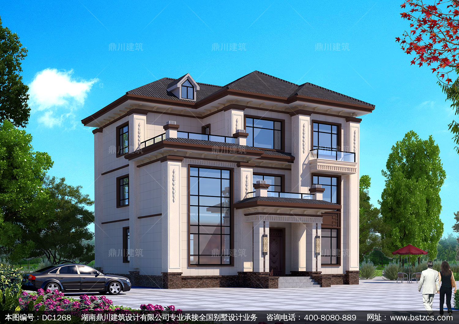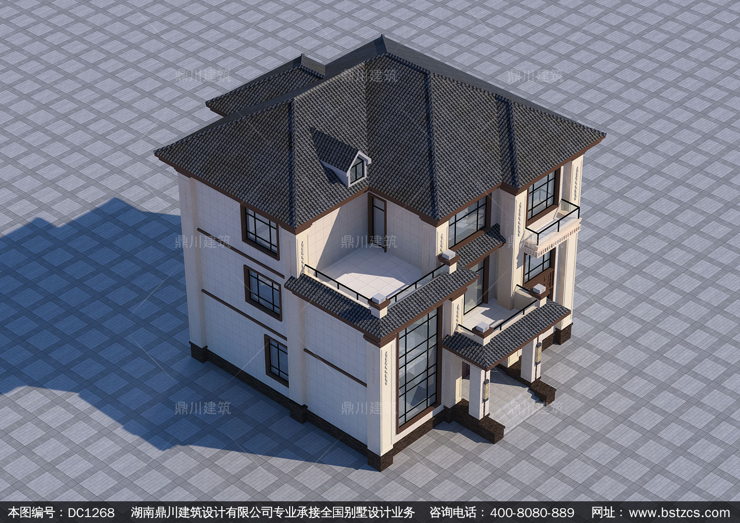 新中式三層帶露臺別墅圖紙效果圖_農村自建別墅設計,鼎川建筑