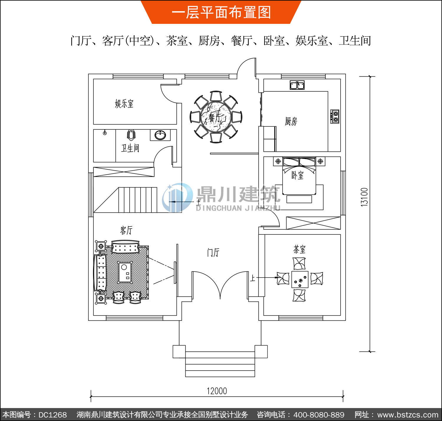| 一 層: | 門廳、客廳(中空)、茶室、廚房、餐廳、臥室、娛樂室、衛生間 | |||