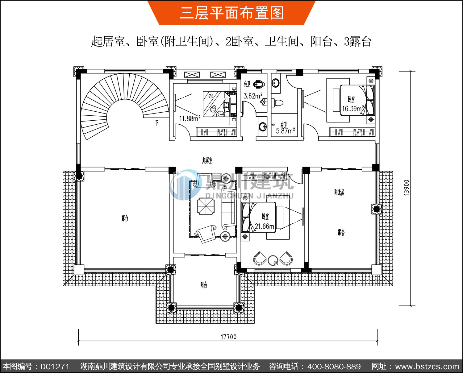 | 三 層: | 起居室、臥室(附衛生間)、2臥室、衛生間、陽臺、3露臺 | |||