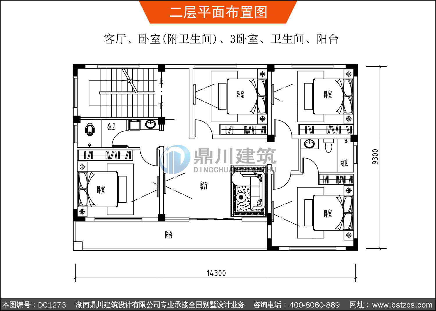 | 二 層: | 客廳、臥室(附衛生間)、3臥室、衛生間、陽臺 | |||