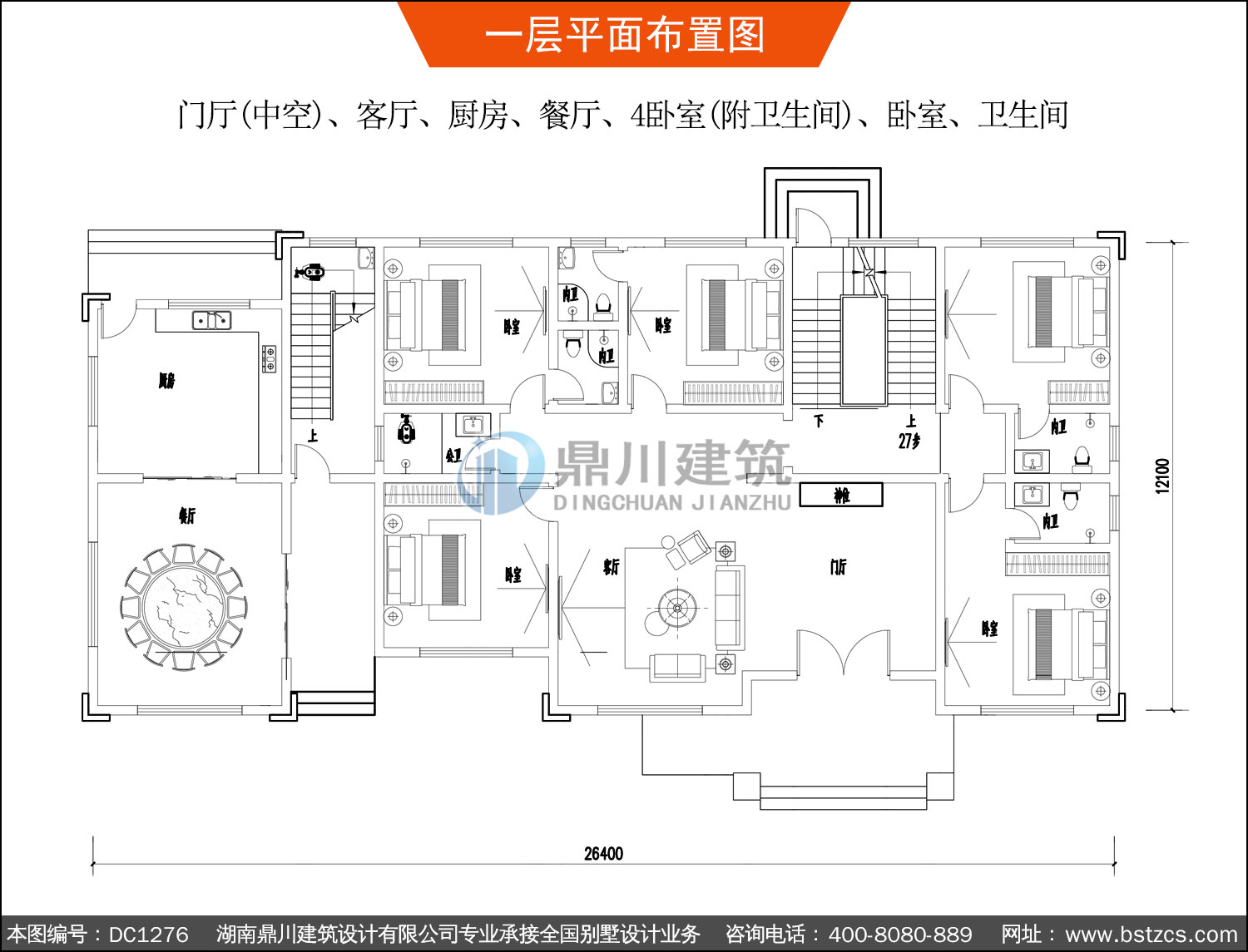 | 一 層: | 門廳(中空)、客廳、廚房、餐廳、4臥室(附衛生間)、臥室、衛生間 | |||