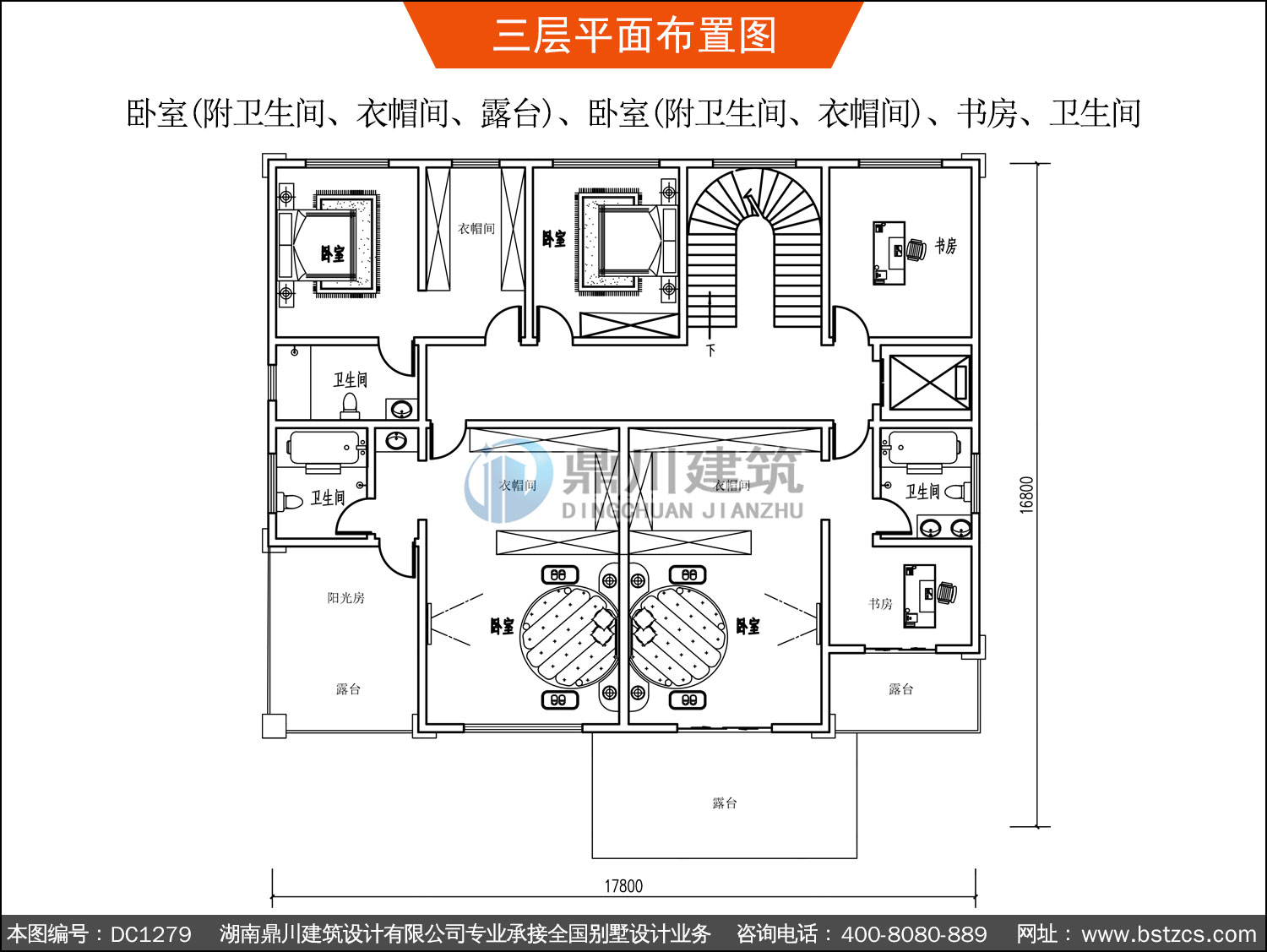 | 三 層: | 臥室(附衛(wèi)生間、衣帽間、露臺)、臥室(附衛(wèi)生間、衣帽間)、書房、衛(wèi)生間 | |||
