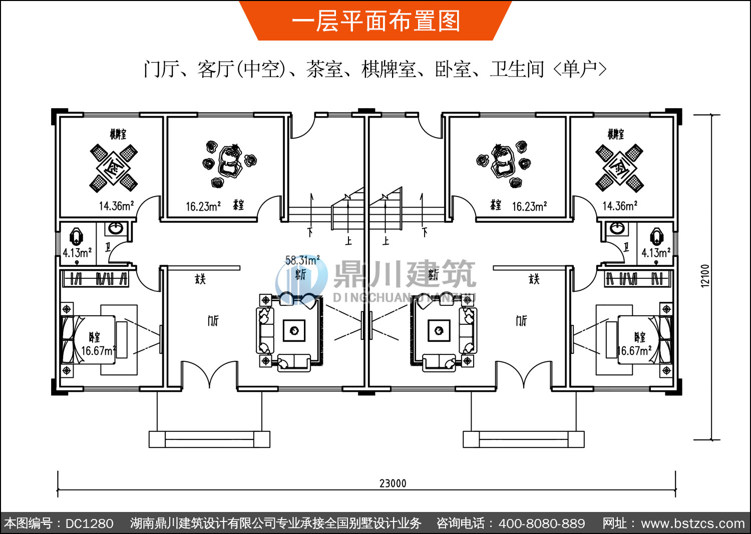 | 一 層: | 門廳、客廳(中空)、茶室、棋牌室、臥室、衛生間 <單戶> | |||
