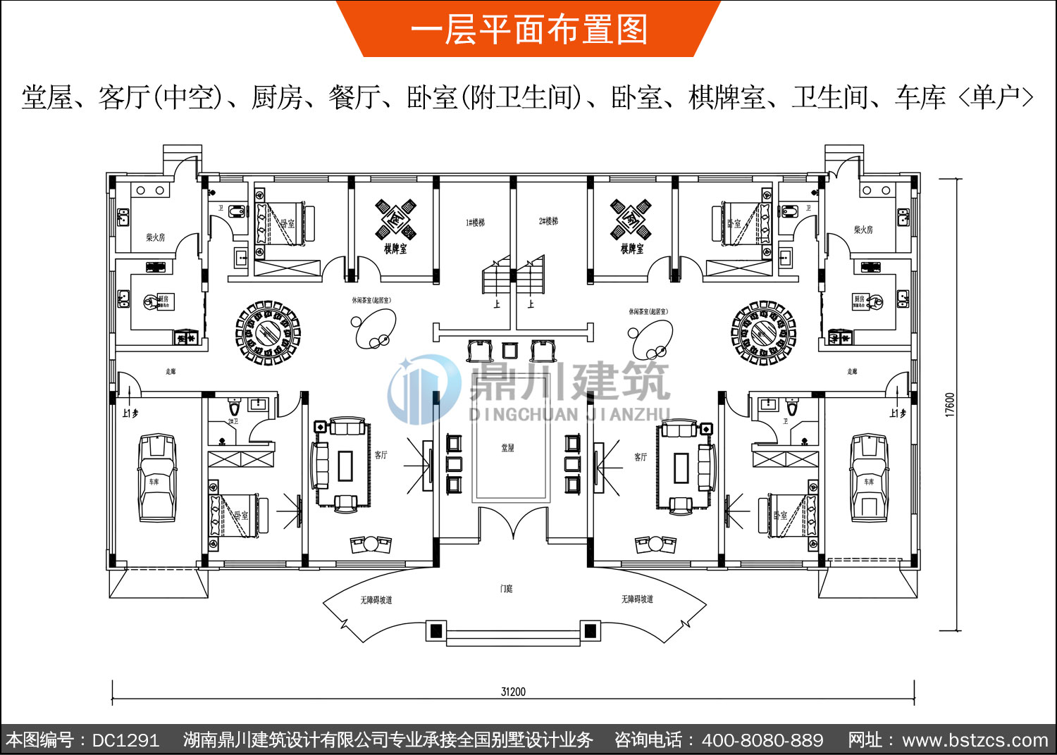 | 一 層: | 堂屋、客廳(中空)、廚房、餐廳、臥室(附衛(wèi)生間)、臥室、棋牌室、衛(wèi)生間、車庫 <單戶> | |||