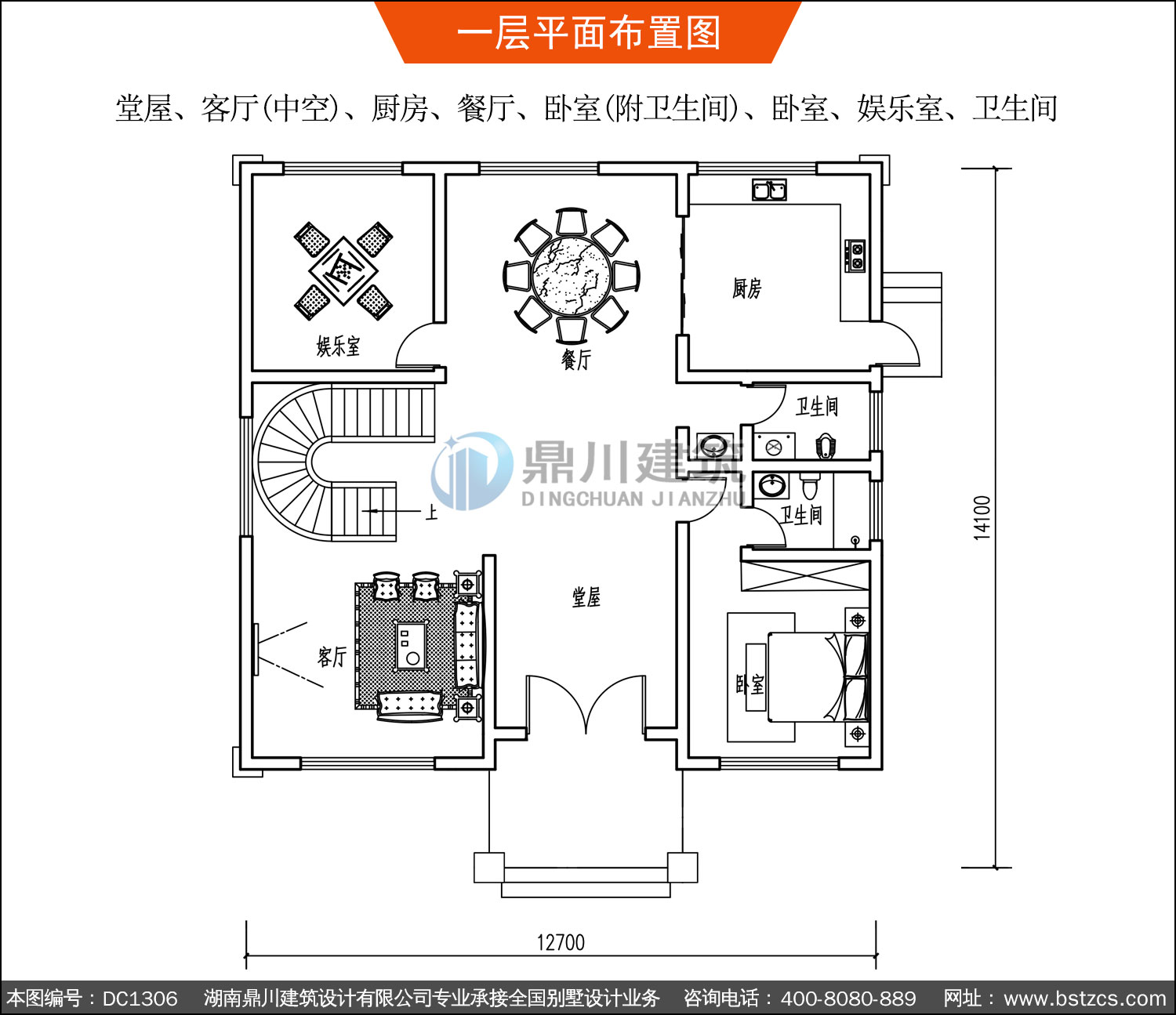 | 一 層: | 堂屋、客廳(中空)、廚房、餐廳、臥室(附衛生間)、臥室、娛樂室、衛生間 | |||